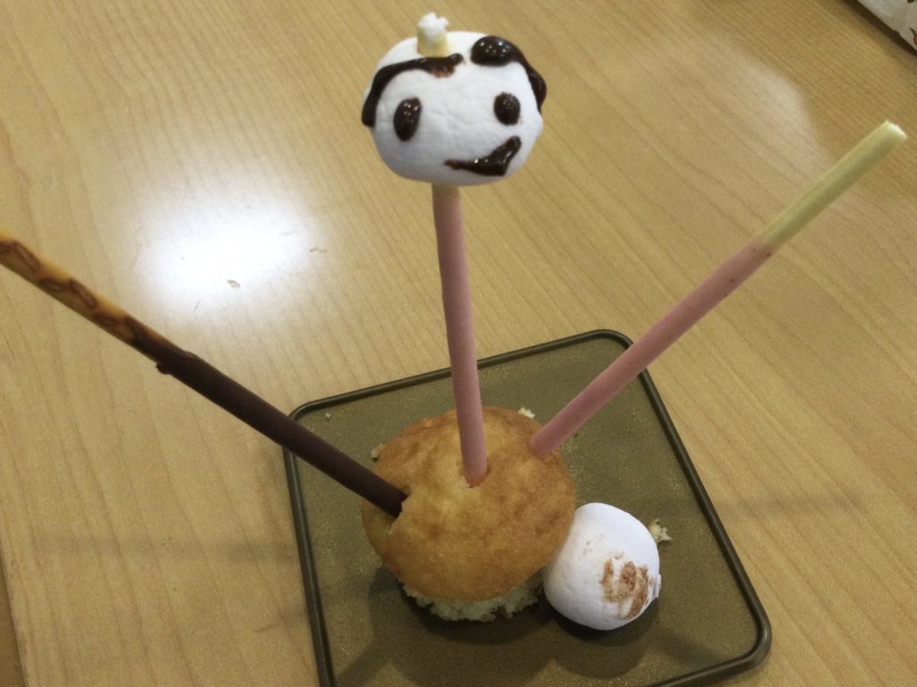 ポッキー、カップケーキ、マシュマロを使って可愛いスイーツを作って下さいと