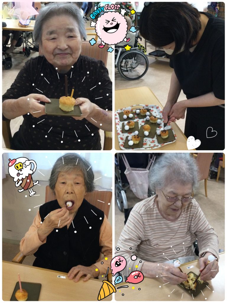 あーでもない、こーでもないとポッキーをさしたりぬいたりして、カップケーキが粉々になったり