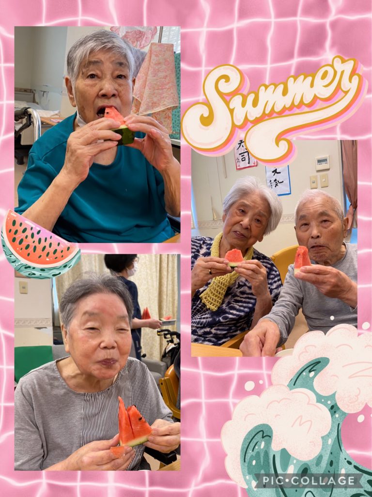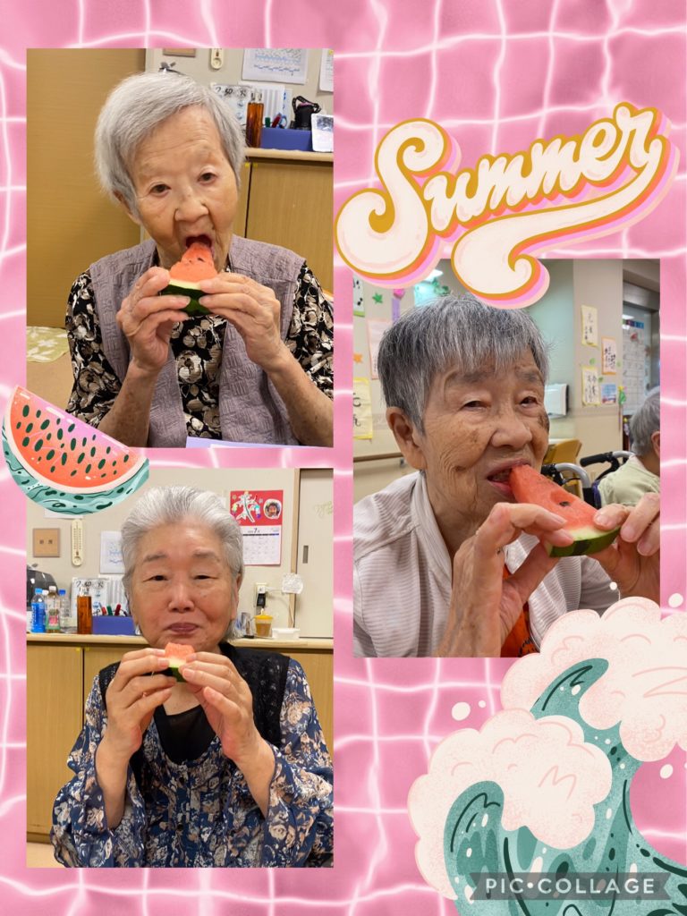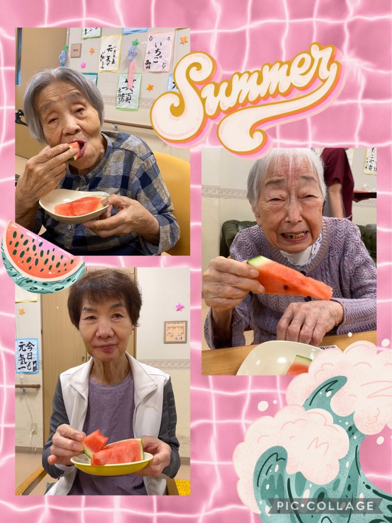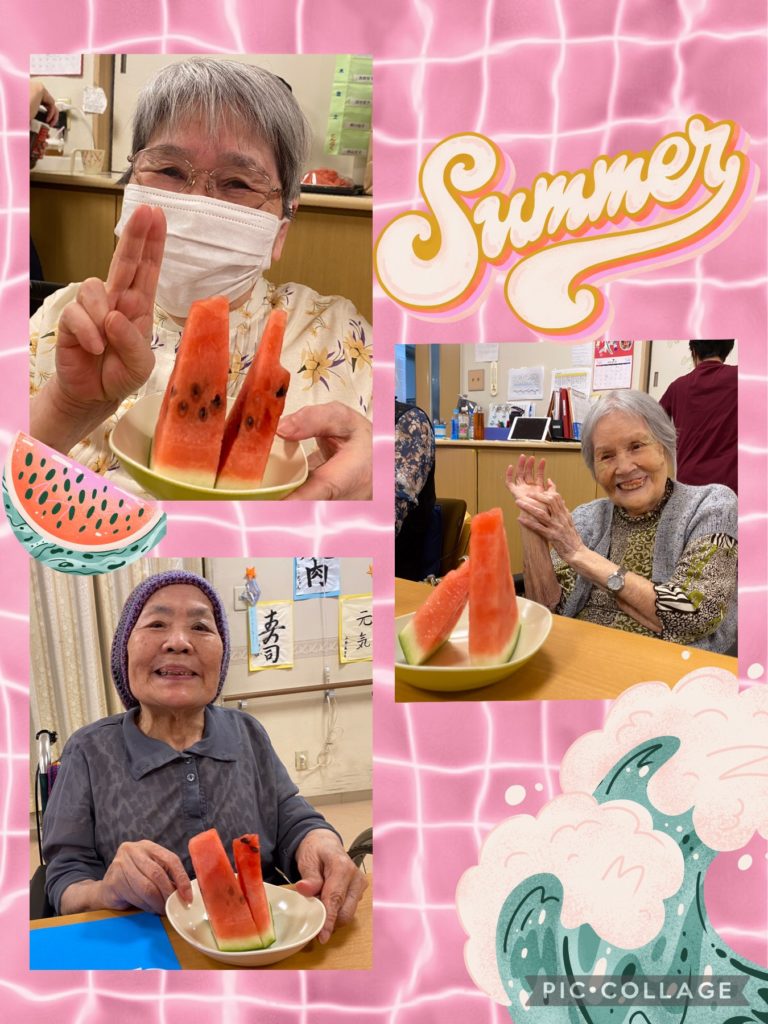 今回は大きな2玉のスイカを買ってくれて、皆はびっくりして、喜んでくれました。「大きなスイカですね。」「美味しい!」、「甘くておいしい」と皆さんが声掛けてくれました。