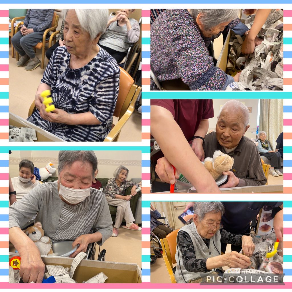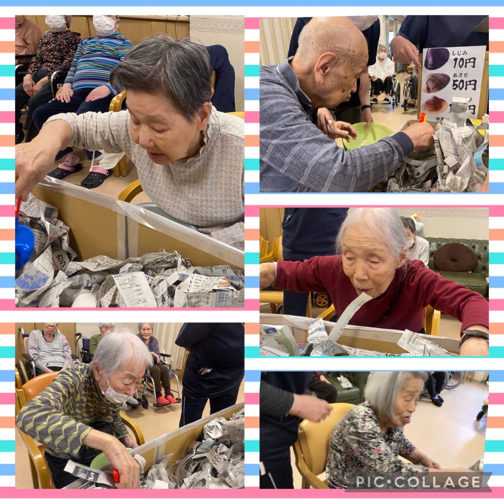 みんなでコップに貝の写真を貼り付けて〜みんなで新聞ビリビリ破って〜