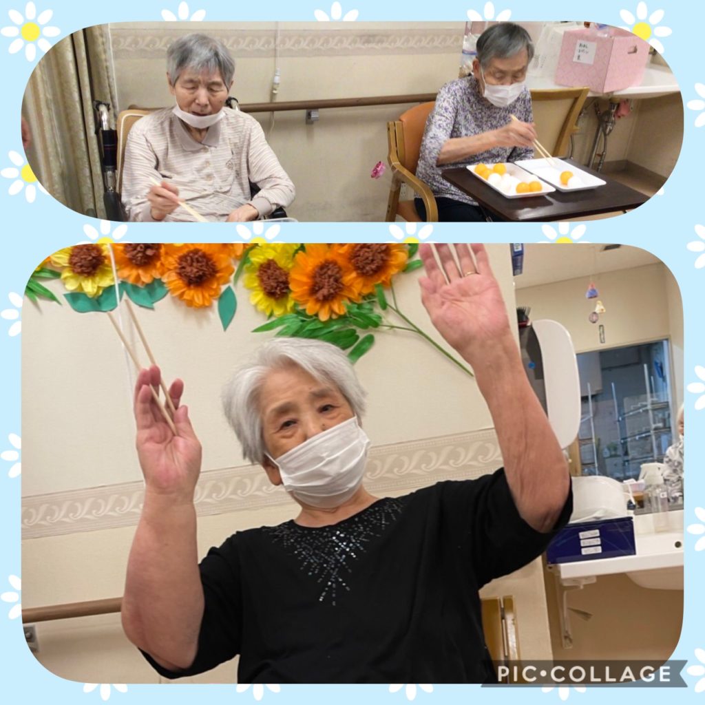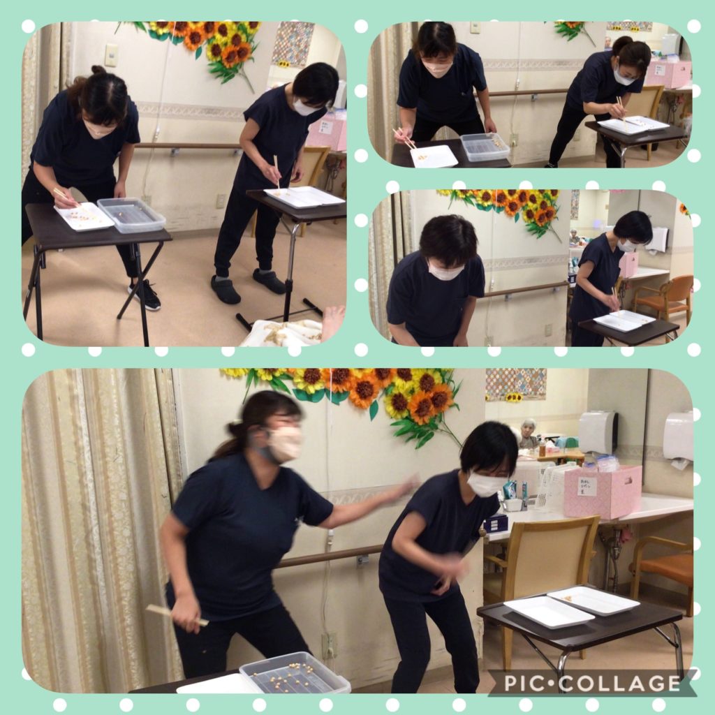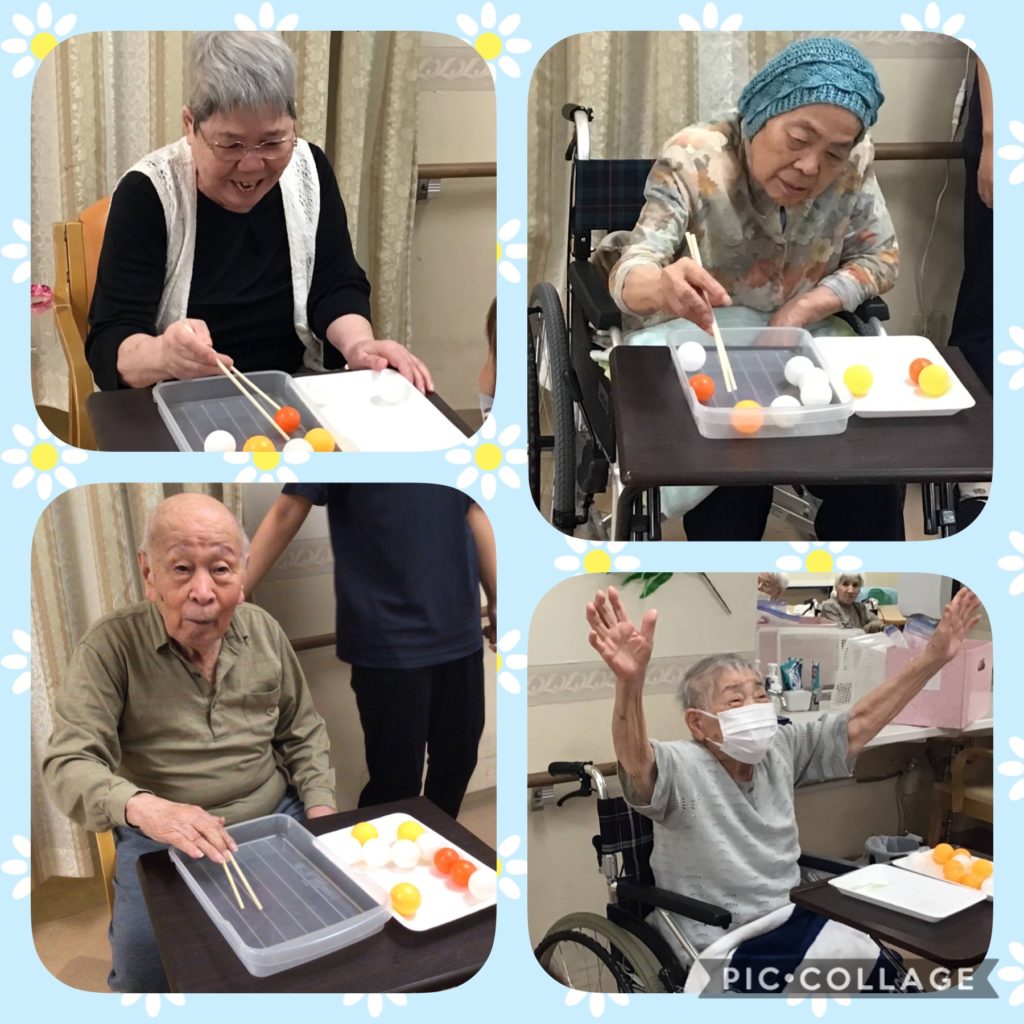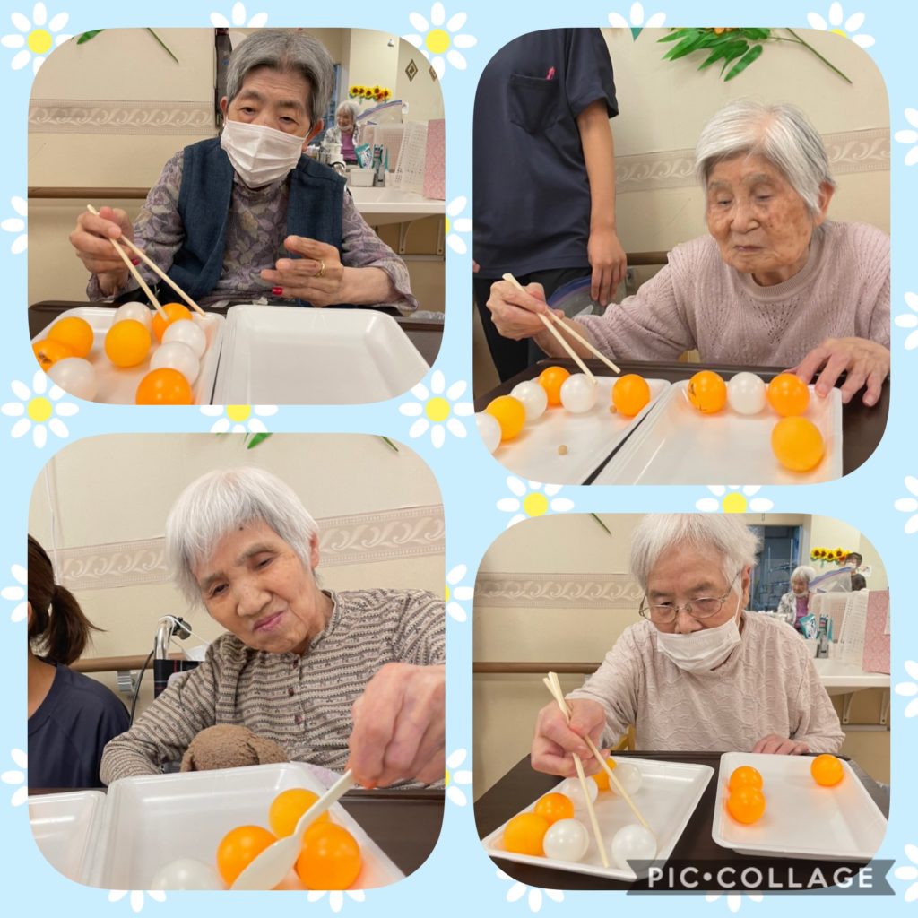 お箸でピン球をつかんでどっちが早く隣の箱に移せるかいざ!勝負!!