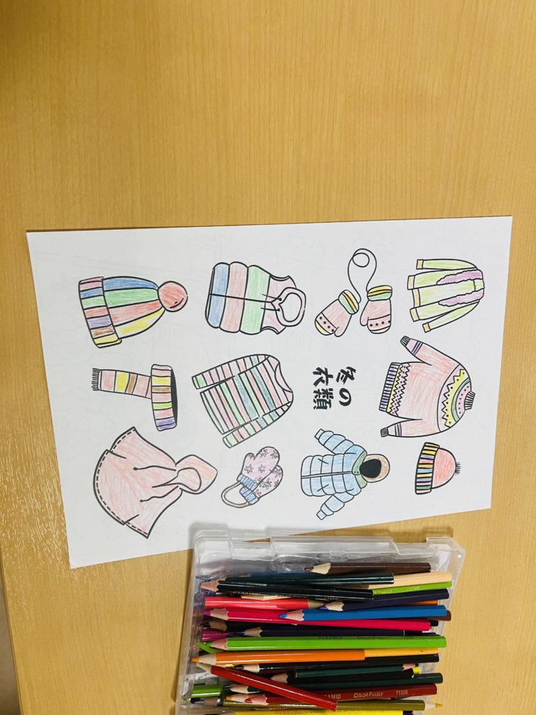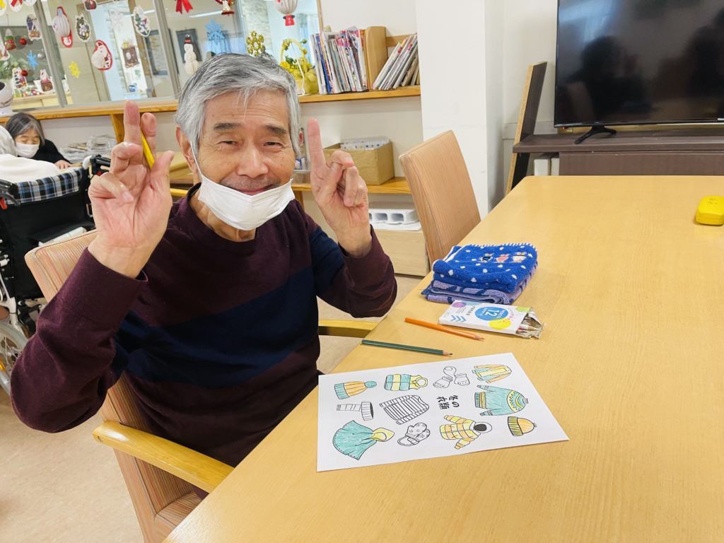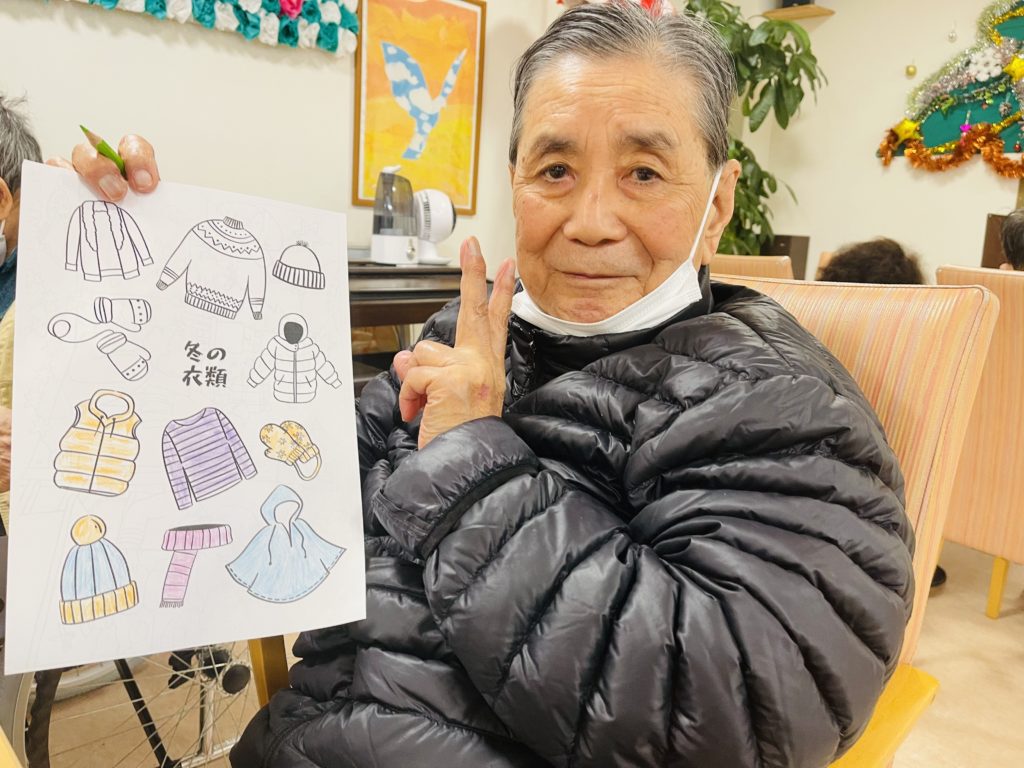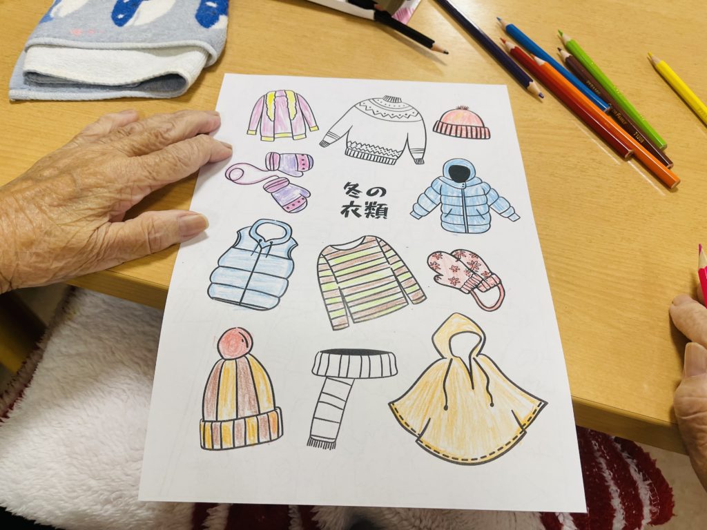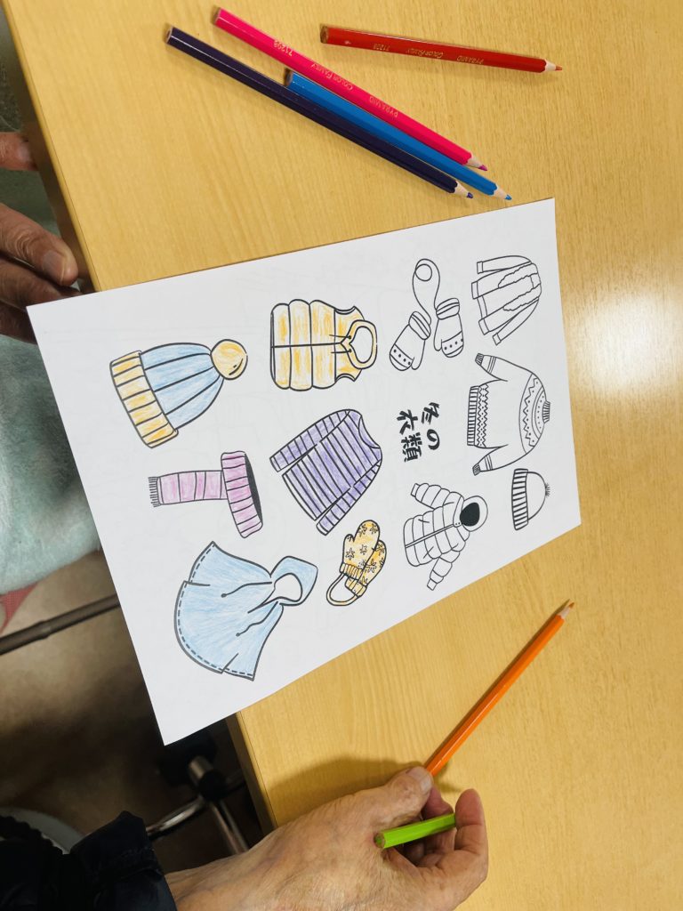 又は、朝の塗り絵のテーマは「冬衣類の色」で、皆様は自分の好きな色を素晴らしく表しました😍