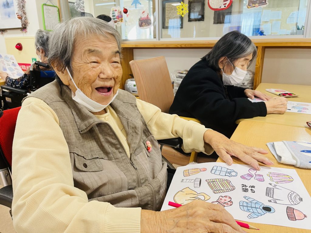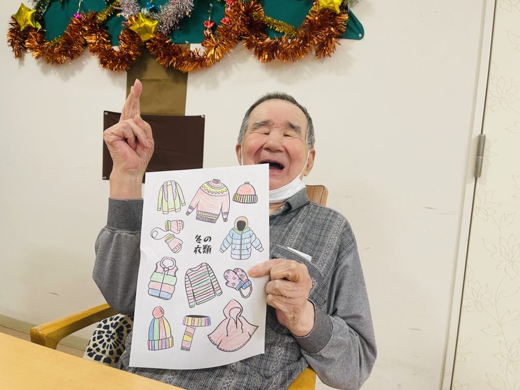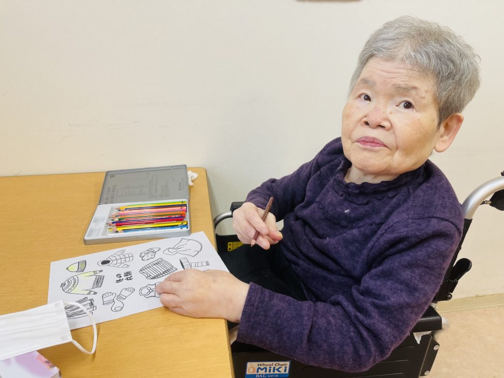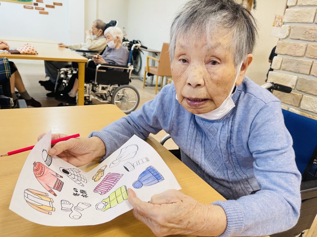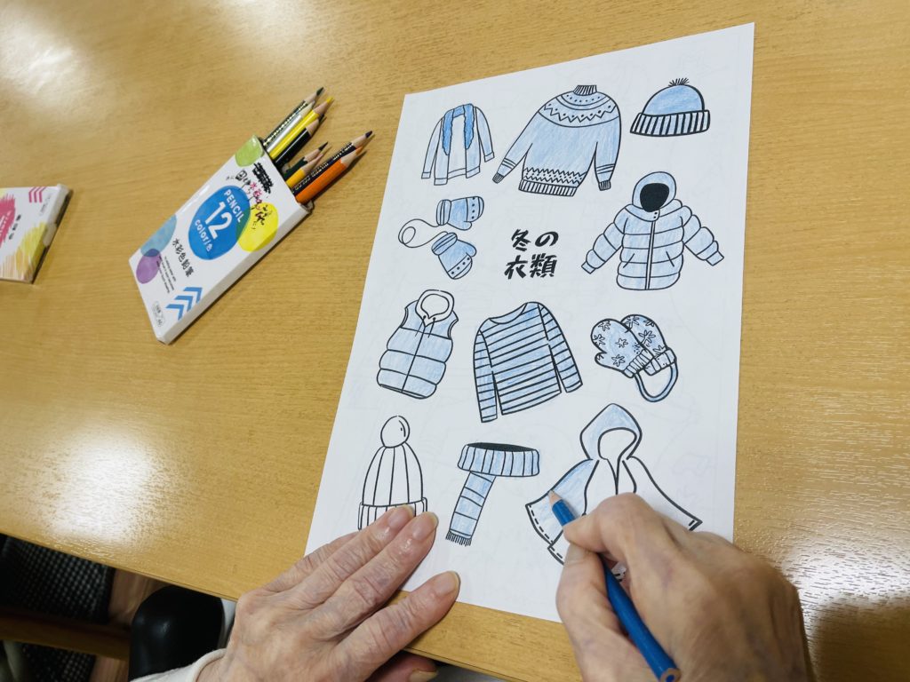又は、朝の塗り絵のテーマは「冬衣類の色」で、皆様は自分の好きな色を素晴らしく表しました😍