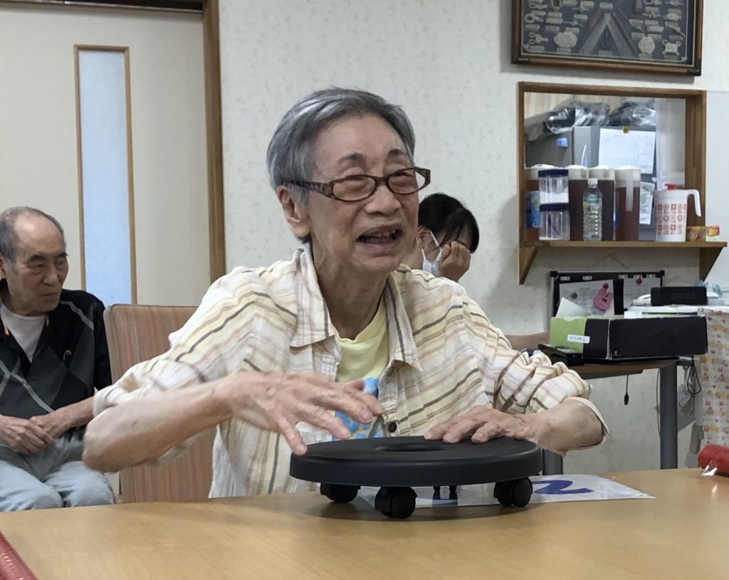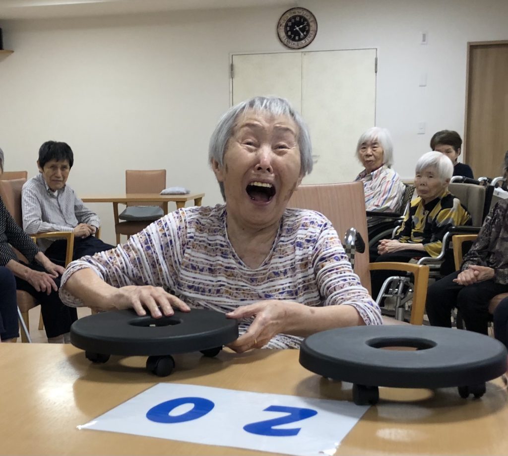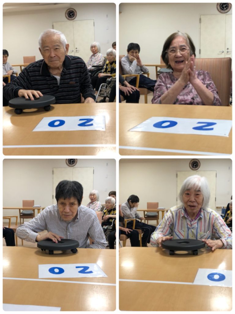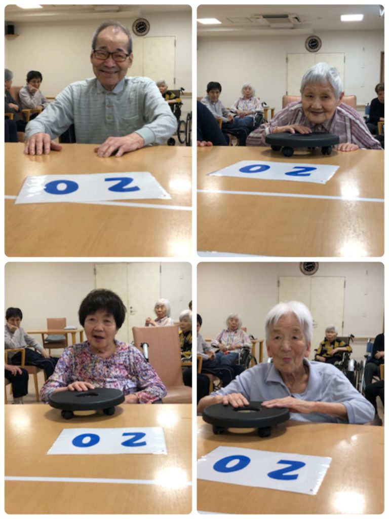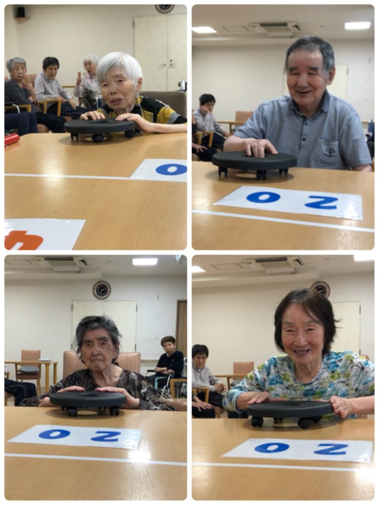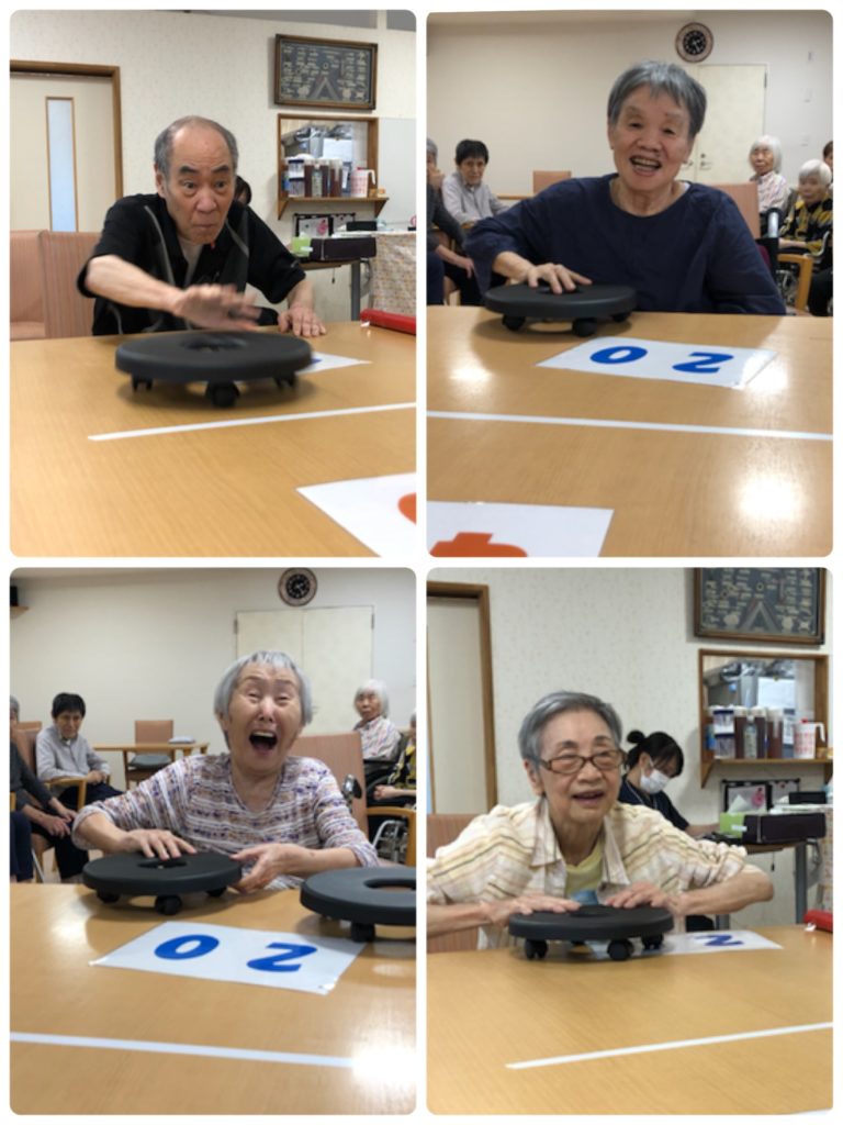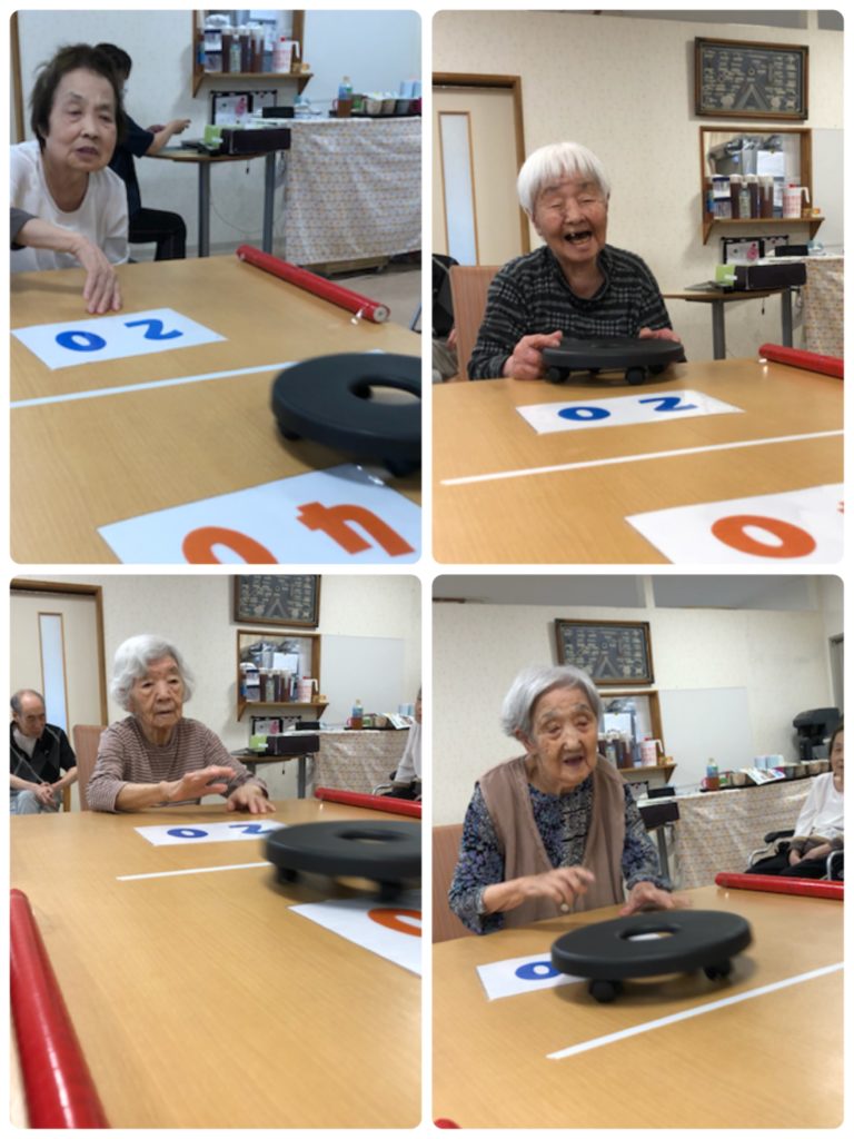 今日のレクリエーションの様子です🤗今日はテーブルカーリング‼️止まったところの点数を競います👍