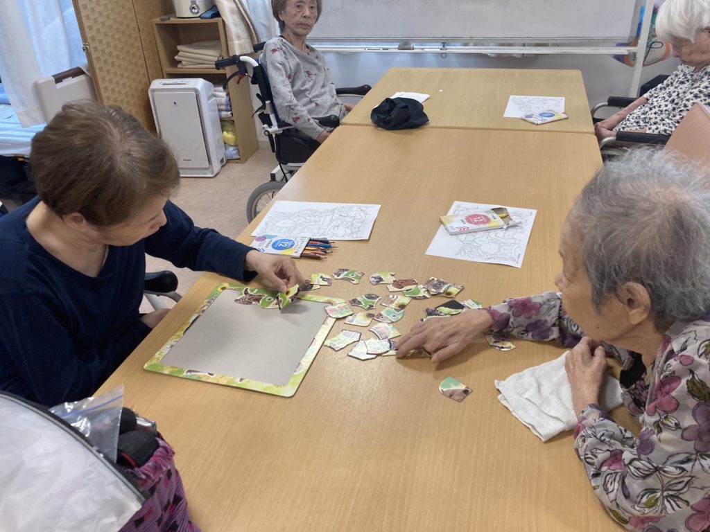 日課でプリントを渡して、脳トレをしてもらっているのですが、脳トレの合間にパズルと数字並べをしていただきました。