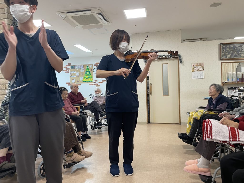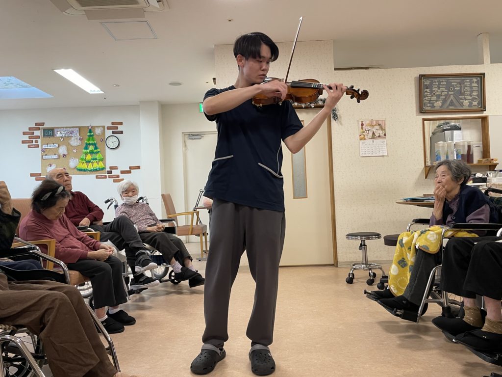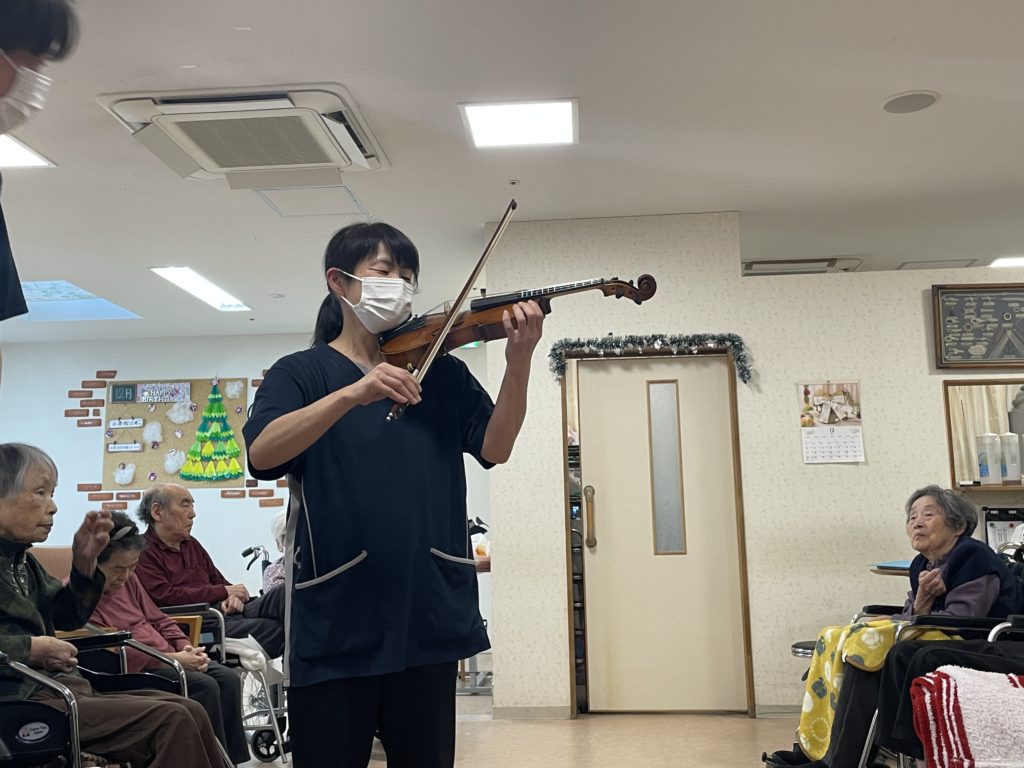 ピアノ演奏の次はバイオリン演奏です。今バイオリンを勉強中らしくとても緊張していました曲目は『オーラリー』『エデンの東』『見よ!勇者は帰る』『メヌエット組曲ト短調』『Frosty the Snowman』を演奏して頂きました‼️
