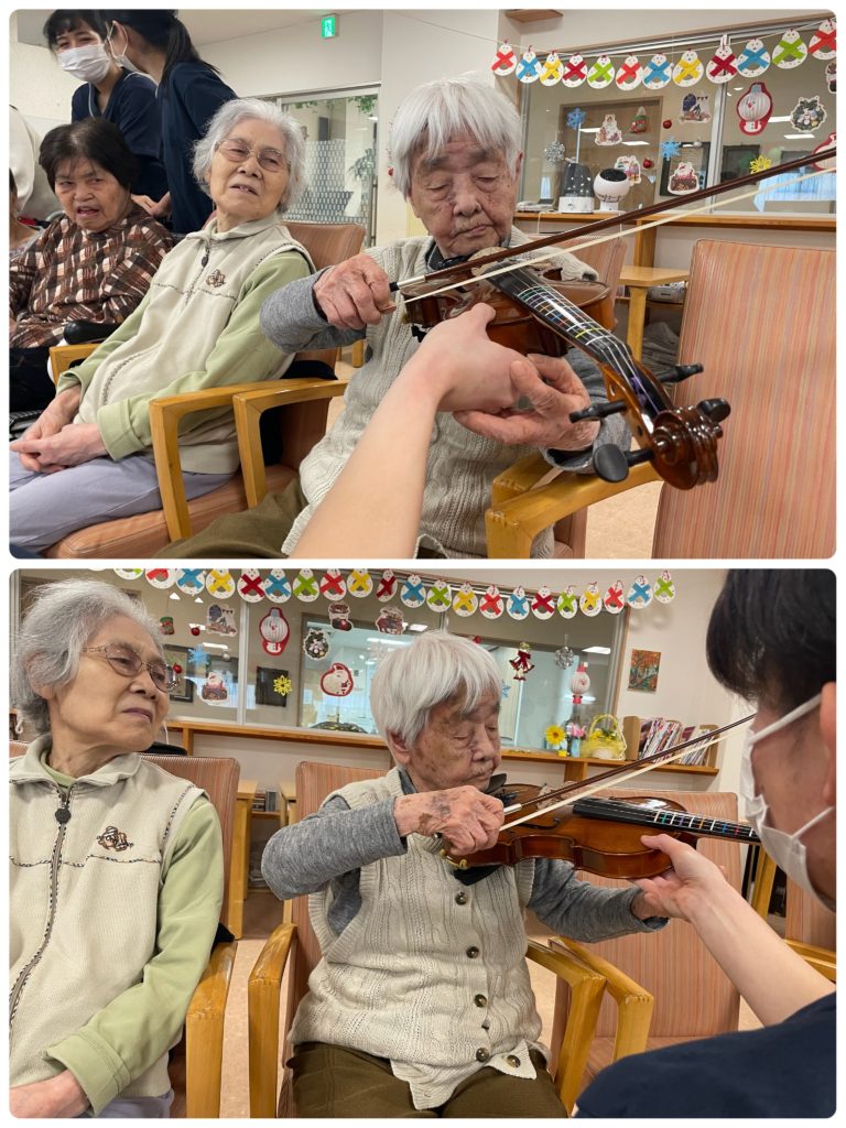 この後は、オルカ先生による指導で実際にスタッフもバイオリンに触れさせて貰いました初めて触るバイオリンにみなさん緊張緊張
