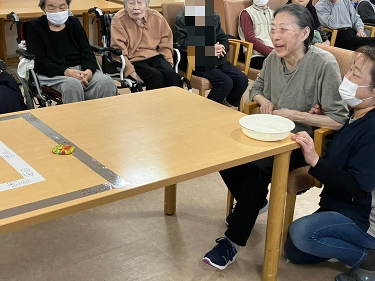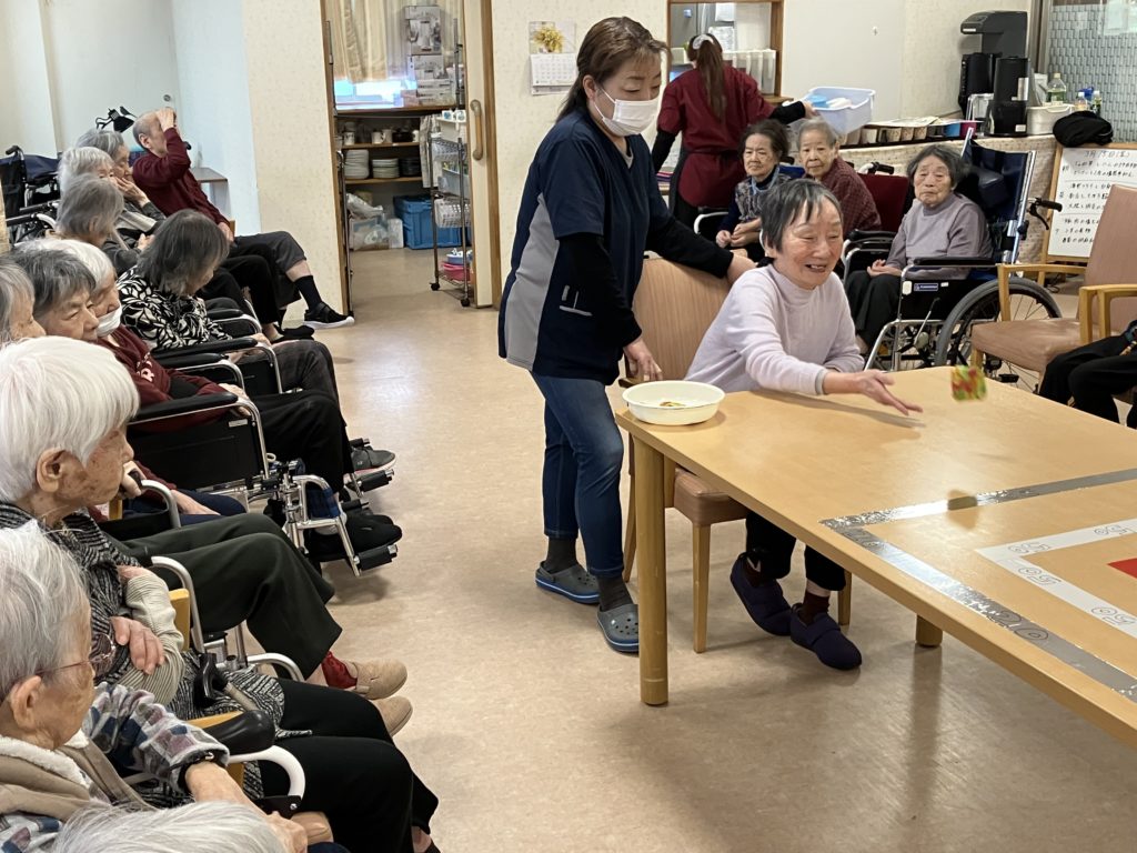 今回のレクレーションはお手玉を投げて得点を競うゲームでした!