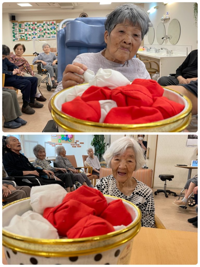 さて今日は卓上玉入れをしました😁🎶赤組・白組に分かれて対戦します😎👍最初は距離感が難しくなかなか入りませんでしたが、徐々に入り出すと白熱のバトルが始まりました😚‼️