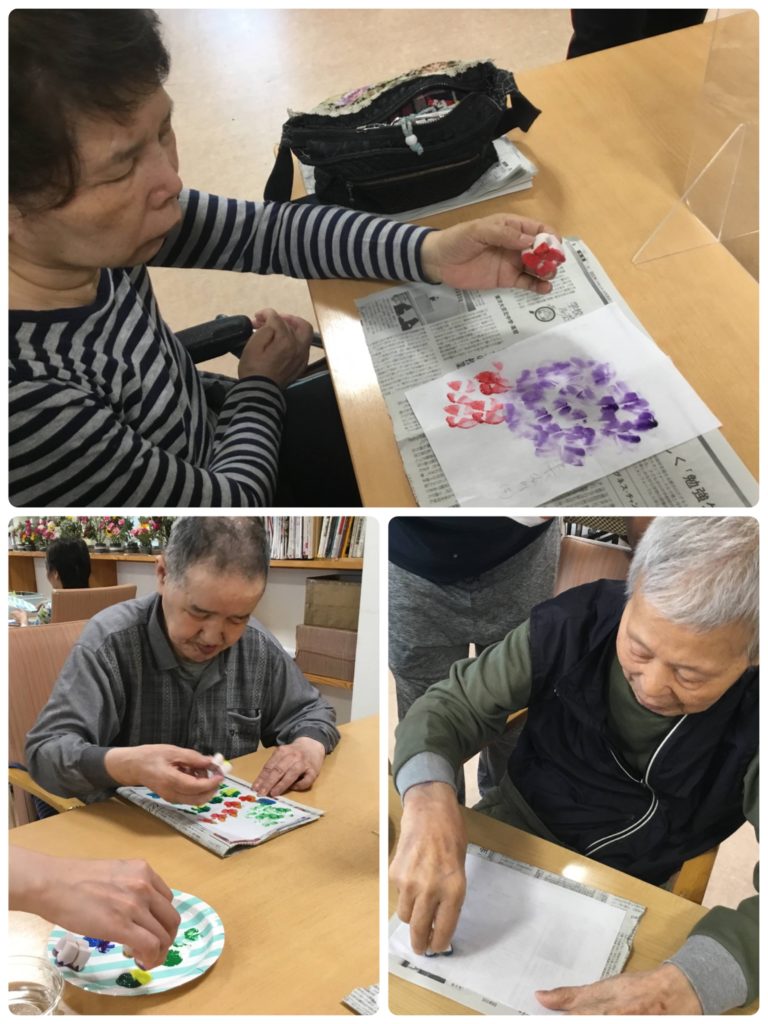 まずはパフを十字に輪ゴムで止めて、パフに絵の具をつけて半紙にハンコのように押していきまーす🎶