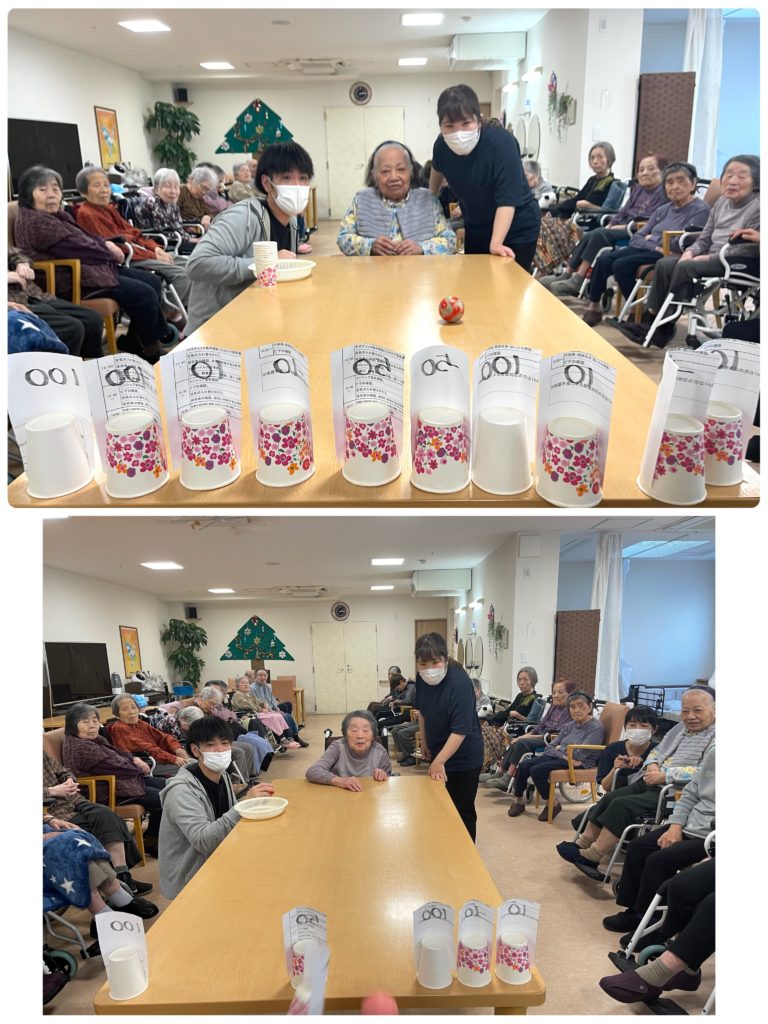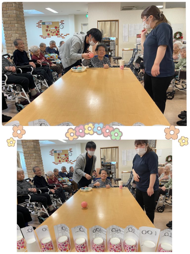 今日のレクはボール🏀を転がして紙コップを倒すゲームです。手の運動もなりますね〜🥰🤭