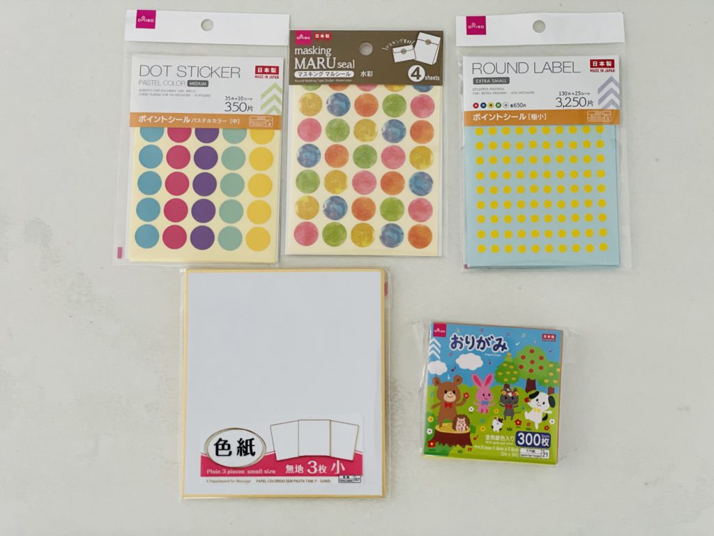 大小の丸シールと折り紙と色紙。